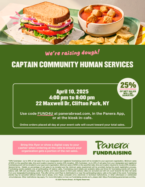 Join us from 4:00-8:00 PM at Panera Bread in Clifton Park and help make a difference! 25% of proceeds will be donated to CAPTAIN Community Human Services!