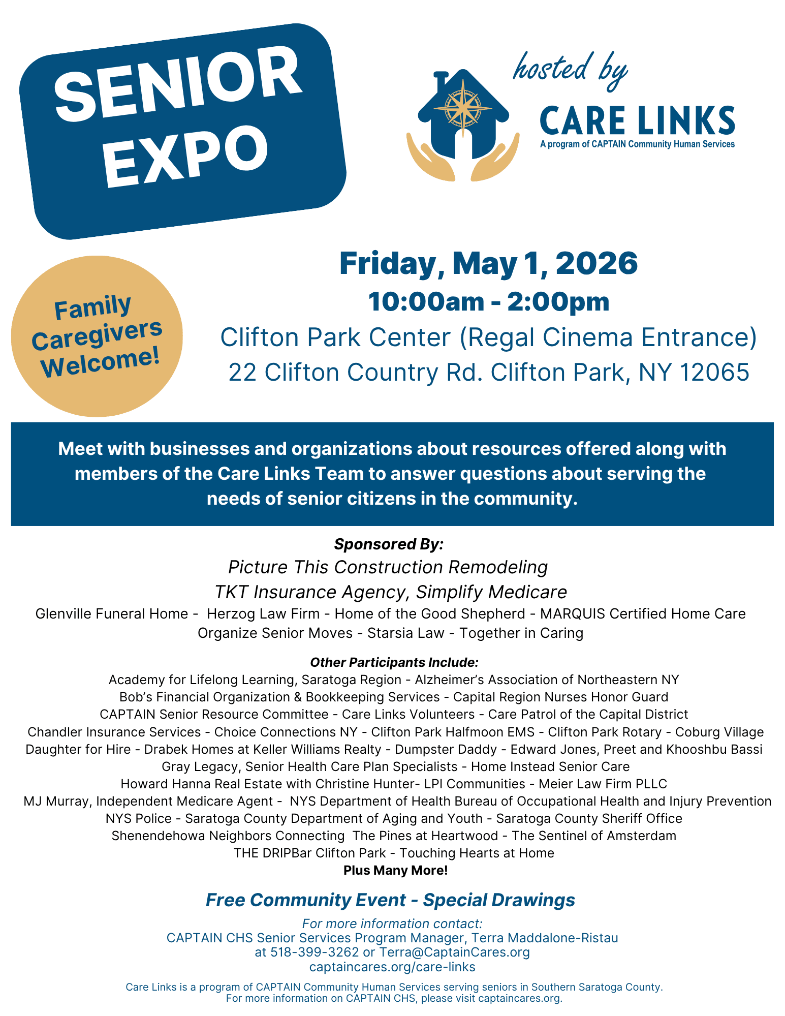 Local businesses and organizations will be present to share resources they offer as well as members of the Care Links Team to answer questions about serving the needs of senior citizens in Southern Saratoga County.